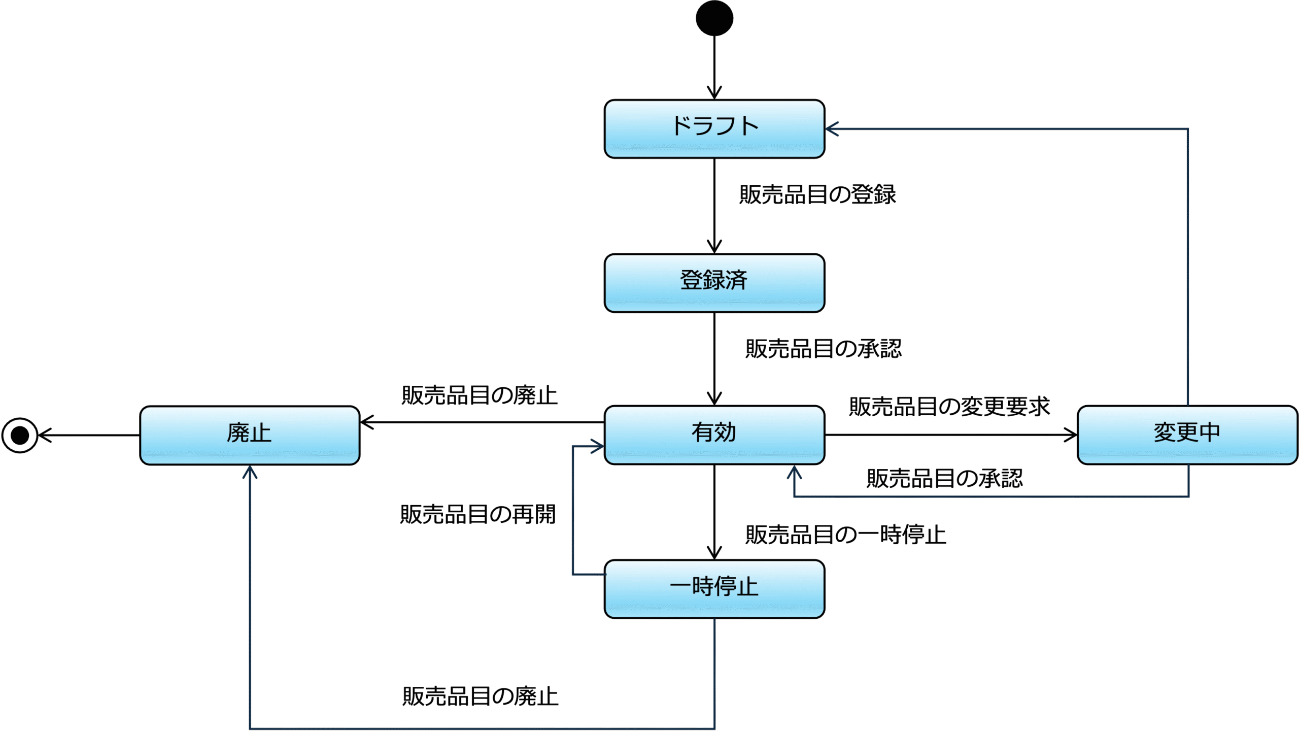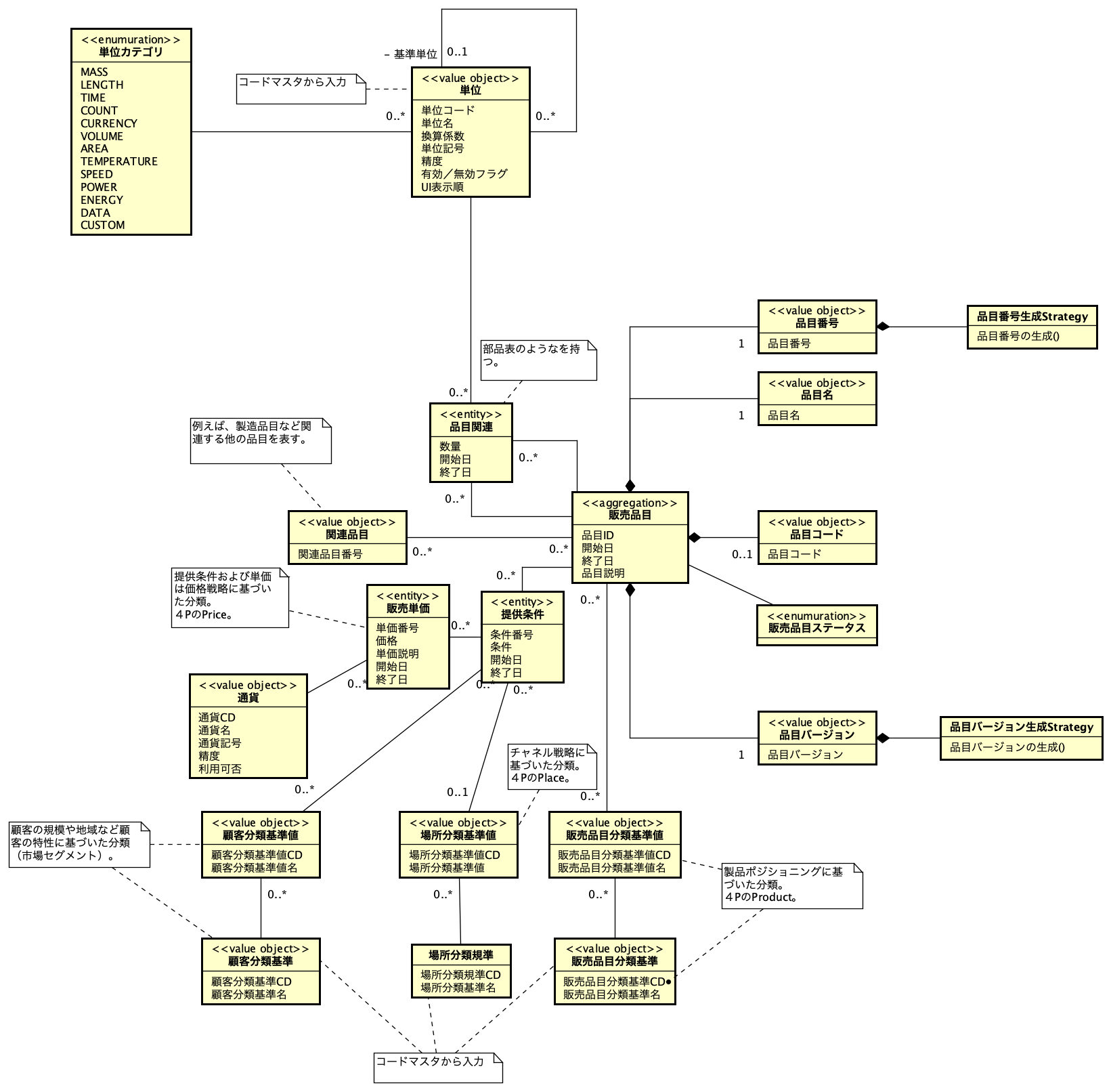 次の図は、販売品目のドメインモデル(概念モデル)の例です。内容の詳細は、ドメインモデル(概念モデル)の設計を参照してください。