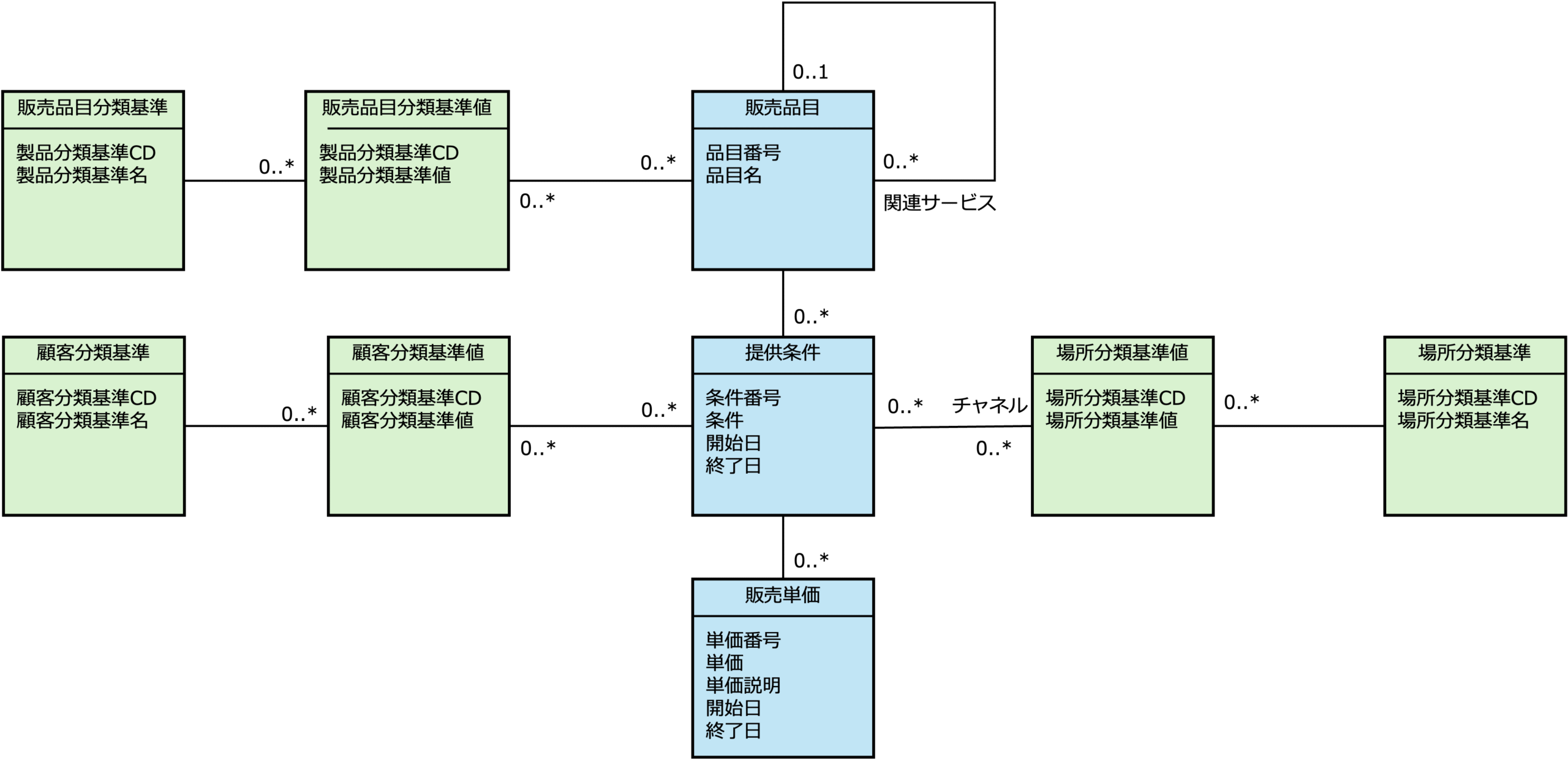 次の図は、販売品目のドメインモデル(論理モデル)の例です。内容の詳細は、ドメインモデル(論理モデル)の設計を参照してください。