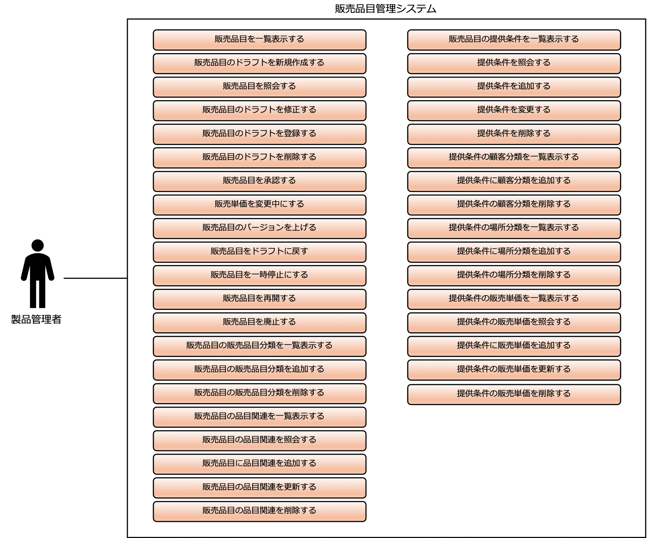 次の図は、販売品目のユースケース(システム機能レベル)の例です。内容の詳細は、ユースケース(システム機能レベル)の設計を参照してください。