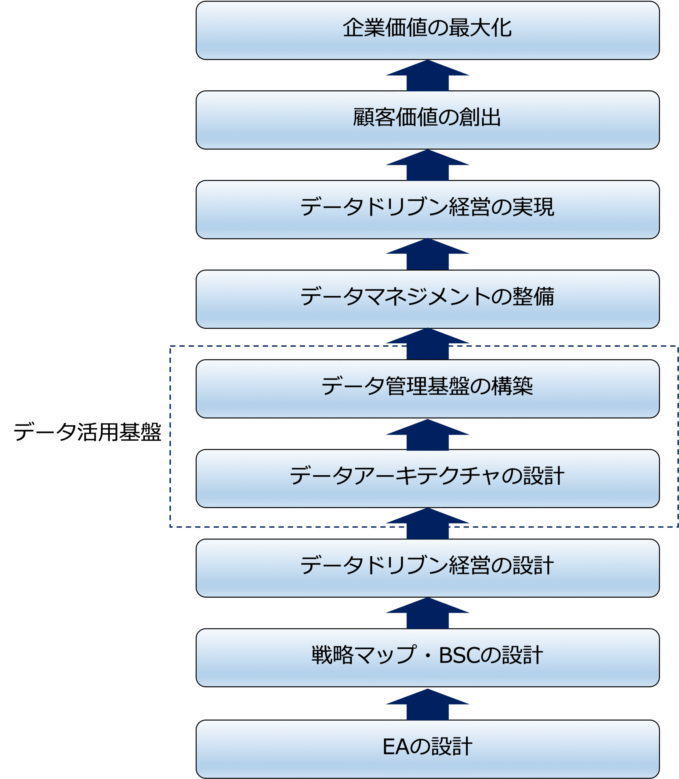次の図は、データ活用基盤を構築し、顧客価値や企業価値を上げるまでのステップを示しています。
